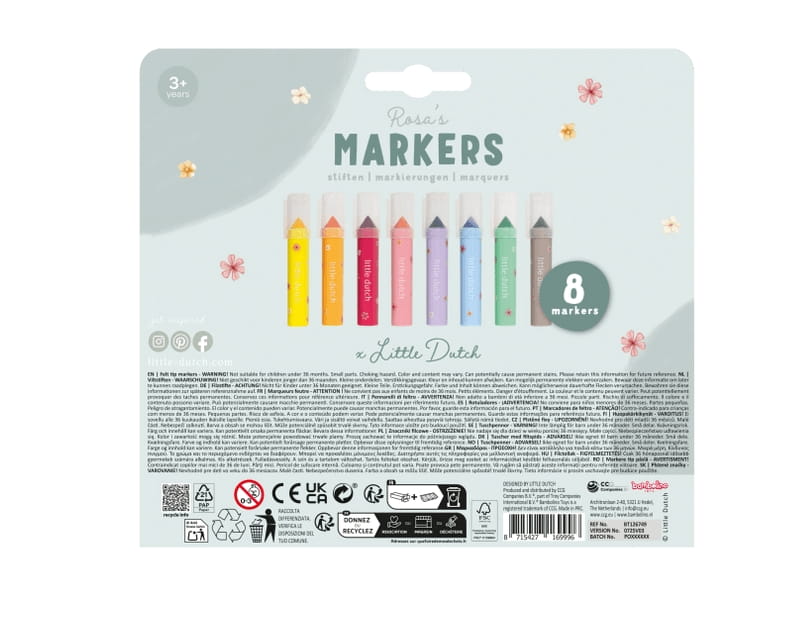 Pozwól swojemu dziecku odkrywać świat kolorów dzięki uroczemu zestawowi markerów Little Dutch! Ten komplet 8 krótkich, grubych markerów w delikatnych pastelowych odcieniach został zaprojektowany specjalnie z myślą o małych rączkach – idealny na pierwsze artystyczne próby i wspólną kreatywną zabawę.