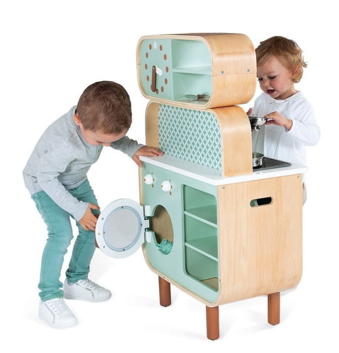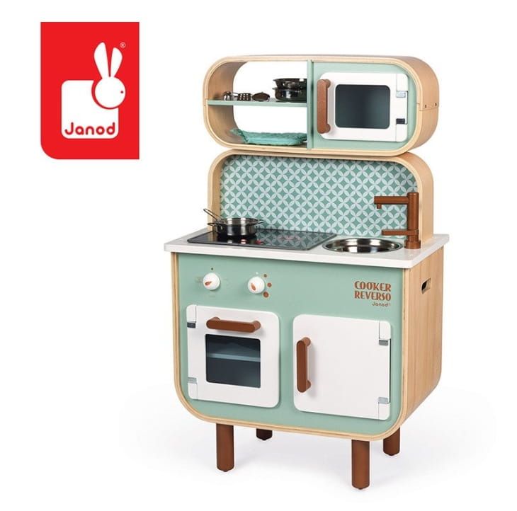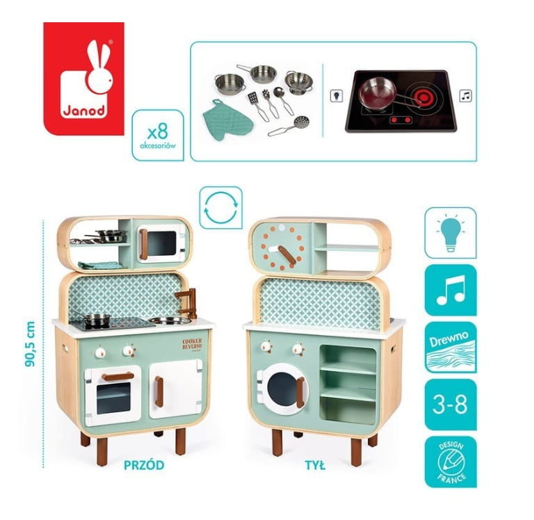 Dwustronna kuchnia z pralką francuskiej marki JANOD to wyjątkowa zabawka dla dzieci w wieku od 3 do 8 lat, która pozwala na kreatywną i angażującą zabawę w gotowanie i pranie. Wykonana z wysokiej jakości drewna w stylu retro, łączy w sobie funkcjonalność, estetykę i bezpieczeństwo użytkowania.