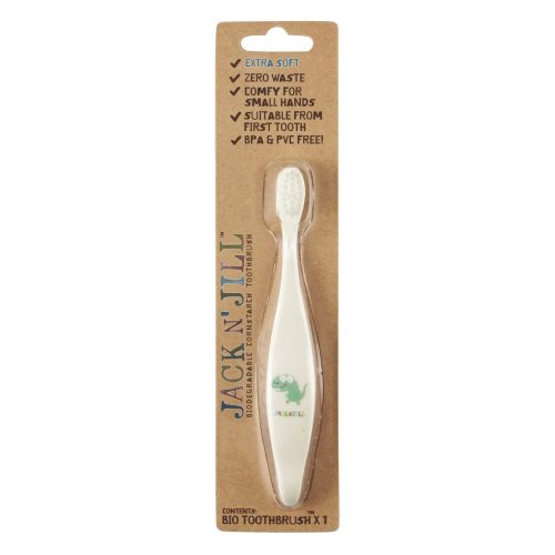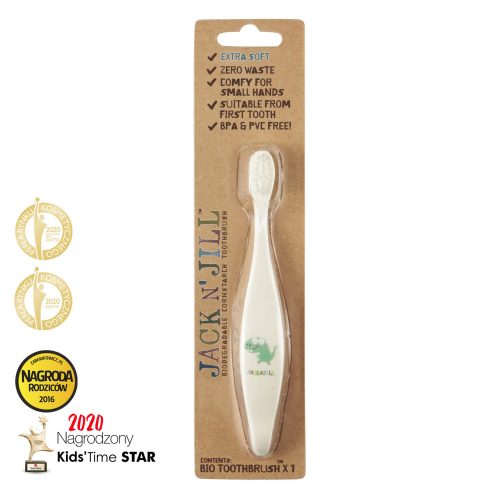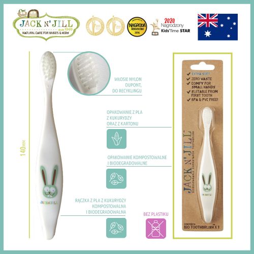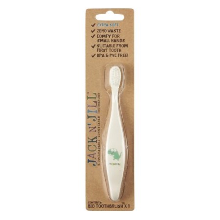 Ekologiczna szczoteczka do zębów Jack N'Jill z nylonowym włosiem i rączką z włókien kukurydzianych. Biodegradowalna, łatwa do kompostowania, bezpieczna dla dzieci.