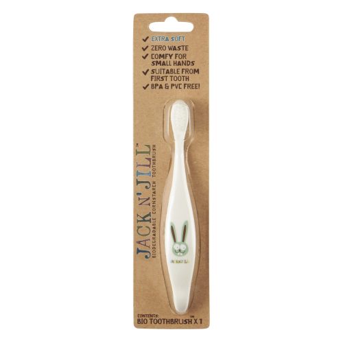Biodegradowalna szczoteczka Jack N'Jill z delikatnym nylonowym włosiem i rączką z włókien kukurydzianych. Łatwa w kompostowaniu, bezpieczna dla dzieci i ekologiczna. Wymieniaj co 8 tygodni.
