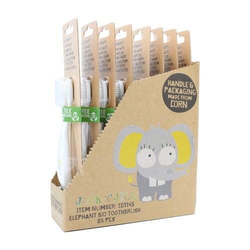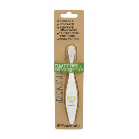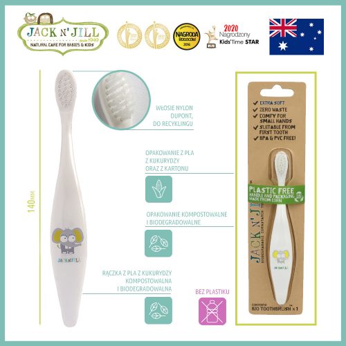 Biodegradowalna szczoteczka do zębów Jack N'Jill dla dzieci. Delikatne nylonowe włosie, rączka z włókien kukurydzianych. Ekologiczna, kompostowalna i bezpieczna dla najmłodszych.