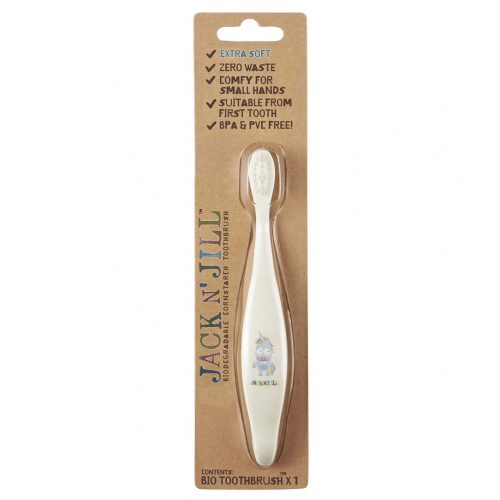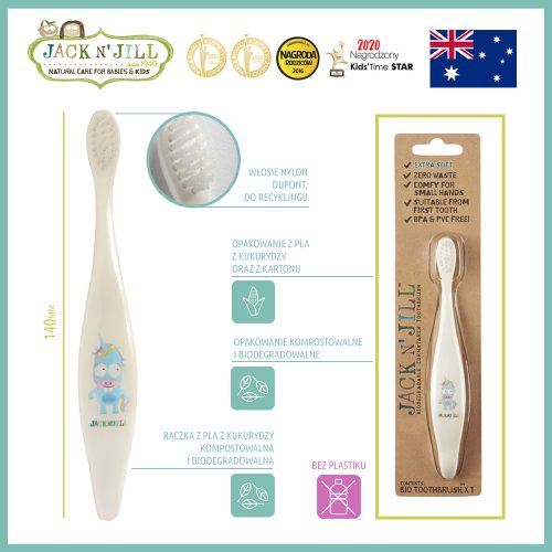 kologiczna szczoteczka do zębów Jack N'Jill z delikatnym nylonowym włosiem i biodegradowalną rączką z włókien kukurydzianych. Bezpieczna dla dzieci, łatwa do kompostowania, przyjazna środowisku.