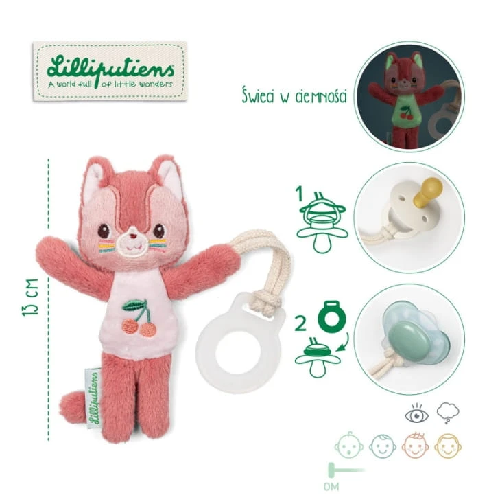 Przytulanka ma postać uroczej różowej kotki z długimi łapkami i subtelnym uśmiechem. Posiada praktyczną sznurkową zawieszkę z możliwością przymocowania smoczka na dwa sposoby, dzięki czemu zawsze jest on w zasięgu dziecka. Jej fluorescencyjne elementy – uszka i brzuszek – świecą w ciemności, co uspokaja i pomaga przezwyciężyć nocne lęki.