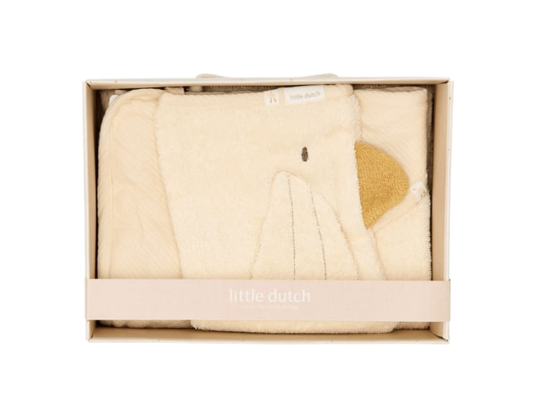 Zestaw prezentowy Little Goose od Little Dutch – idealny upominek dla noworodka. Zawiera mięciutką myjkę w kształcie gąski oraz ręcznik kąpielowy z kapturkiem. Wykonane w 100% z bawełny organicznej. Eleganckie opakowanie prezentowe, praktyczne i stylowe.