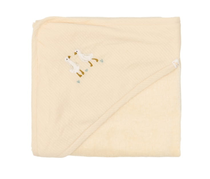 - Ręcznik kąpielowy z kapturkiem – 75x75 cm, z uroczym kapturkiem w gąskę, idealny po kąpieli, otula i ogrzewa maluszka.