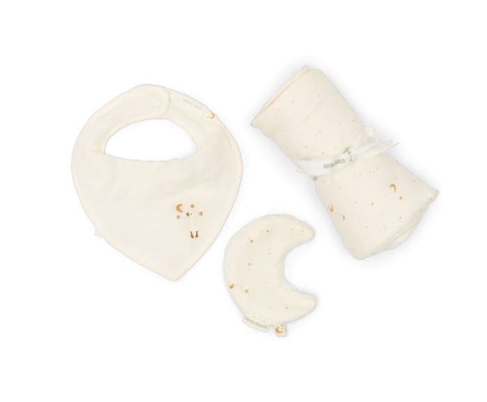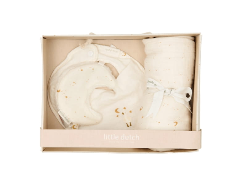 Zestaw prezentowy Moon & Stars od Little Dutch – idealny prezent dla noworodka. Zawiera zawieszkę w kształcie księżyca, miękki muślinowy otulacz 120x120 cm i bandanę z haftowaną ozdobą. Wykonane w 100% z bawełny organicznej. Eleganckie pudełko prezentowe i pastelowa kolorystyka.