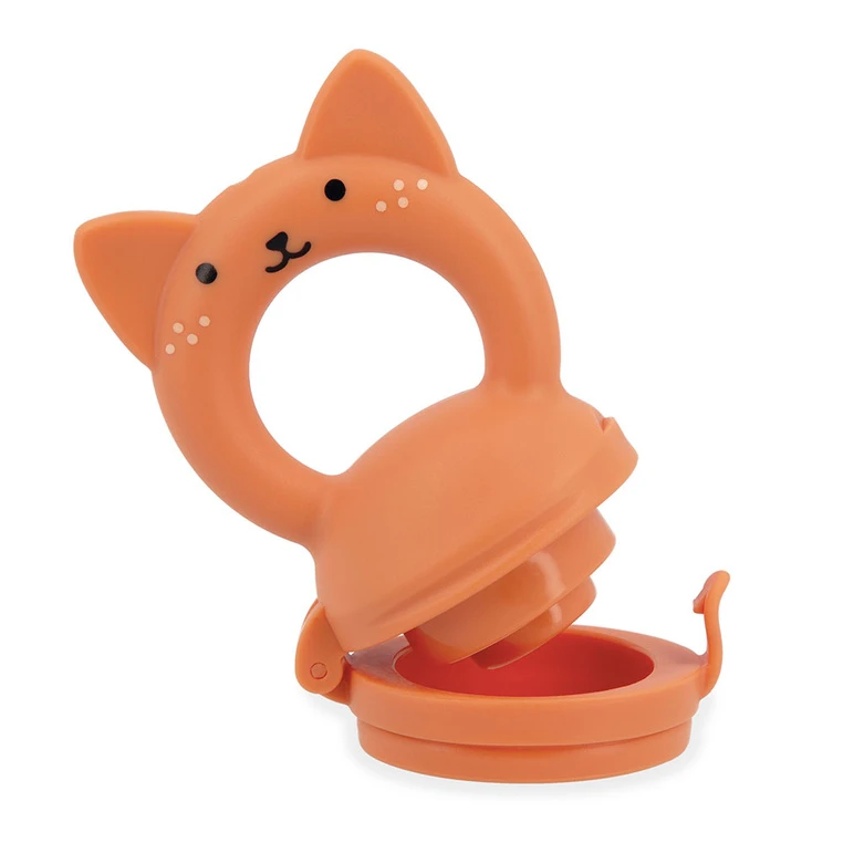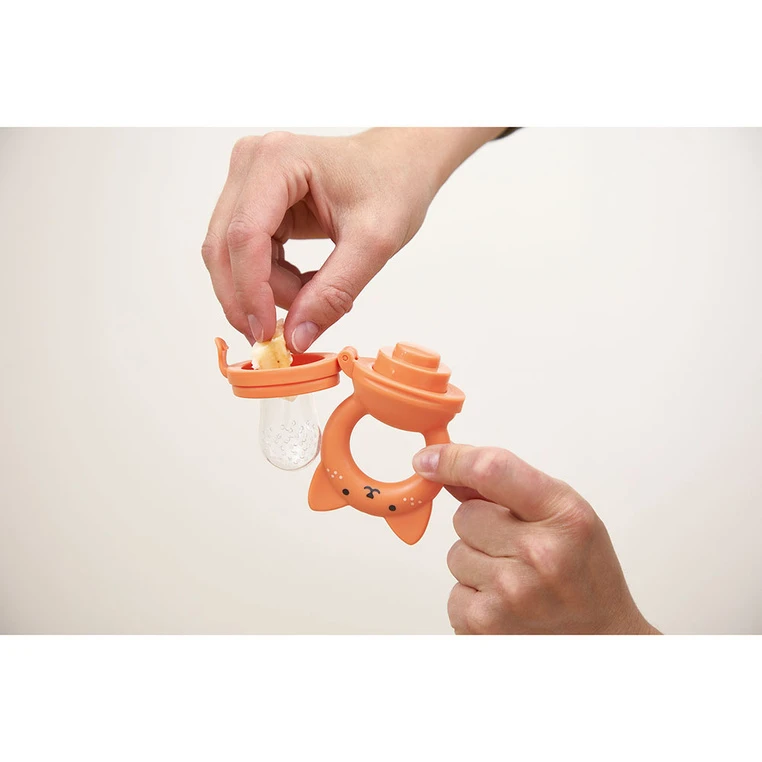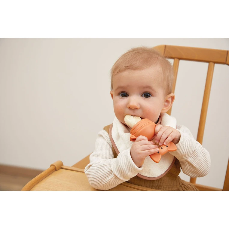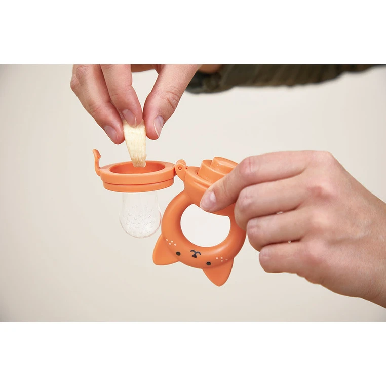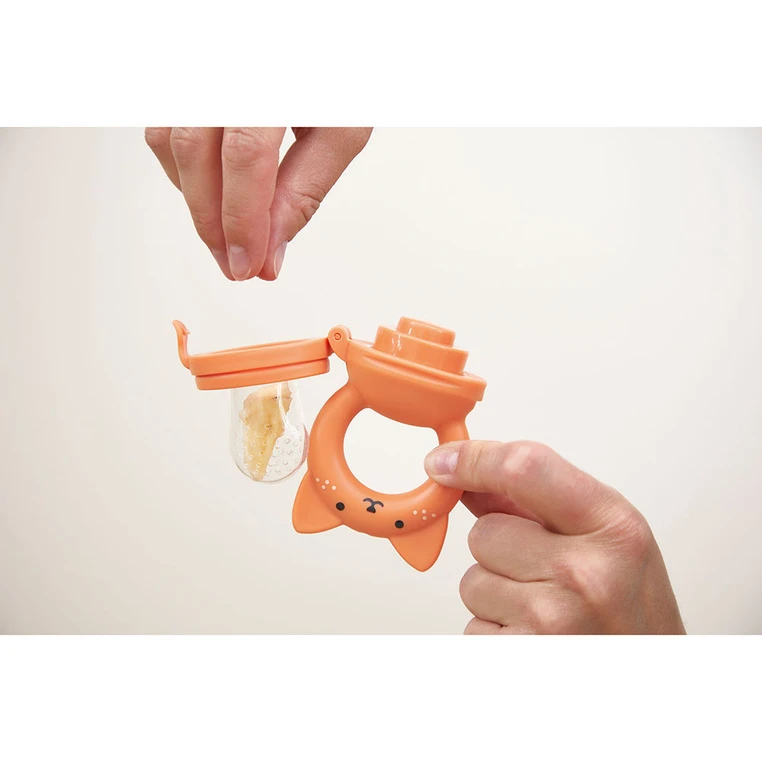 - Stymulacja sensoryczna – małe otwory w silikonowej końcówce sprawiają, że smoczek uwalnia smaki w postaci przecieru lub soku, pobudzając zmysły i zachęcając do poznawania nowych tekstur.