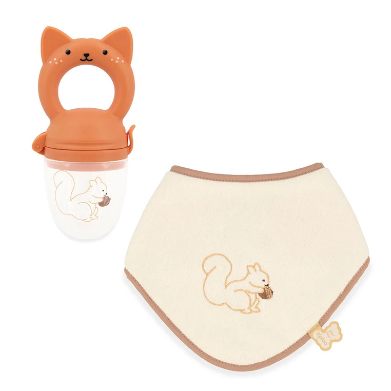 Kaloo Zestaw prezentowy Gryzak smoczek do owoców + śliniak Wiewiórka Grignoti