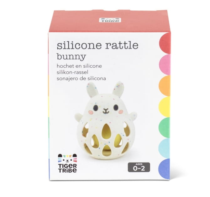 Silikonowa Grzechotka Królik od Tiger Tribe to miękka, bezpieczna i łatwa do chwytania grzechotka dla maluszków. Delikatnie grzechocze przy potrząsaniu lub ściskaniu, wspierając rozwój sensoryczny i motoryczny dzieci 0–2 lata. Wykonana z silikonu BPA-free.