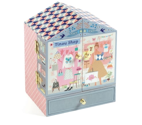 - drewniana szkatułka z pozytywką w kształcie butiku Tinou,