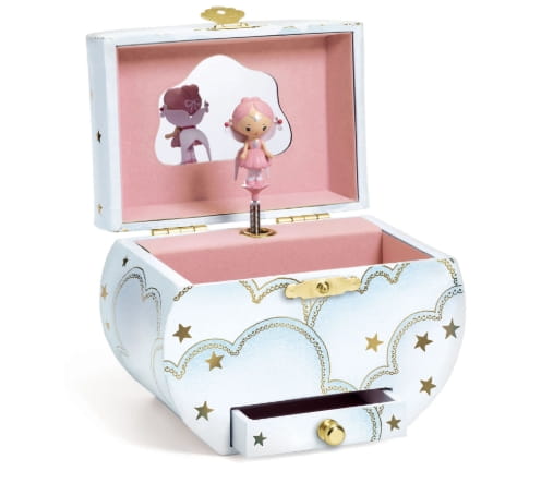 Drewniana szkatułka z pozytywką w kształcie chmurki z obracającą się figurką elfa i lusterkiem. Gra melodię autorstwa Carl Maria von Weber – „Zaproszenie do tańca”. Miękkie, aksamitne wnętrze chroni biżuterię. Idealna ozdoba do pokoju dziecka 4+.