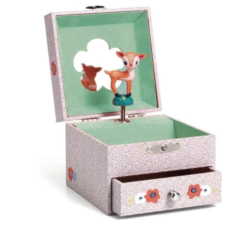 Drewniana szkatułka z pozytywką – muzyczne pudełko na biżuterię z jelonkiem