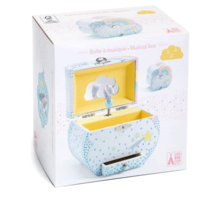 Pięknie zaprojektowana drewniana szkatułka z pozytywką w kształcie chmurki to wyjątkowe muzyczne pudełko na biżuterię dla dzieci od 4 lat. Na wierzchu znajduje się uroczy motyw jednorożców na chmurce, a wewnątrz lusterko i figurka jednorożca, która obraca się grając melodię „Nad pięknym Modrym Dunajem” Johanna Straussa.