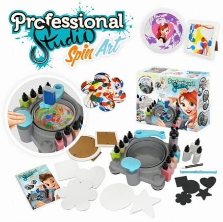 Zestaw Spin Art do tworzenia abstrakcyjnych, wirujących obrazków bez użycia baterii. Wybierz kształt, obracaj arkusz i dodawaj farby, brokat lub własne kolory. W zestawie stacja robocza, farby, szablony, ramki i akcesoria. Idealny dla dzieci 7+.