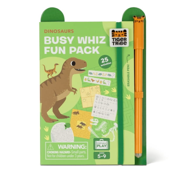 Tiger Tribe Paczka Pełna Frajdy – Dinozaury to kompaktowa książeczka z łamigłówkami, labiryntami i grami słownymi o motywie dinozaurów dla dzieci 5–9 lat. Zawiera zmazywalny pisak i arkusz naklejek, idealna w podróży do rozwijania kreatywności, koncentracji i zdolności manualnych.