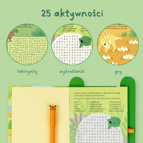 Deszczowy dzień, długa podróż czy chwile nudy? Paczka Pełna Frajdy – Dinozaury od Tiger Tribe to kompaktowa książeczka, która zapewni dzieciom godziny kreatywnej zabawy. Zawiera różnorodne zadania o tematyce dinozaurów – labirynty, zagadki, gry słowne i łamigłówki logiczne – dostosowane do wieku 5–9 lat.