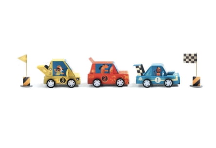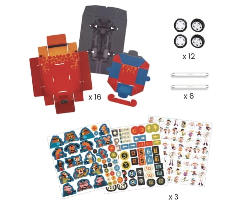 Kreatywny zestaw do samodzielnego wykonania 3 samochodów wyścigowych. Zawiera kartonowe elementy, naklejki, kółka, osie i instrukcję krok po kroku. Idealny dla dzieci 5+, świetny na zabawy urodzinowe. Wykonany z papieru z certyfikatem FSC MIX. Produkt z oznaczeniem CE.