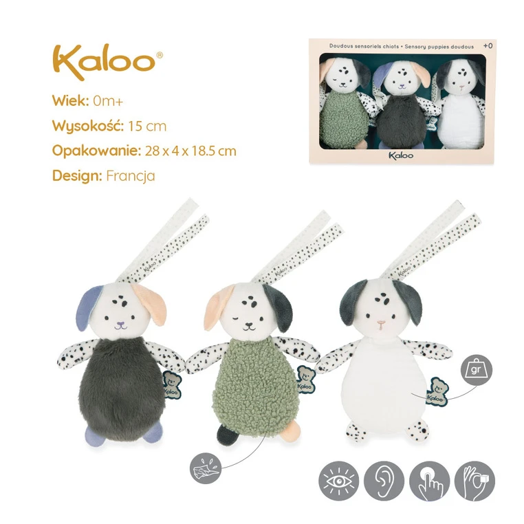 Zestaw 3 przytulanek z kolekcji Stimuli francuskiej marki Kaloo to urocze zawieszki w kształcie piesków, które wspierają rozwój sensoryczny niemowlęcia już od pierwszych dni życia.