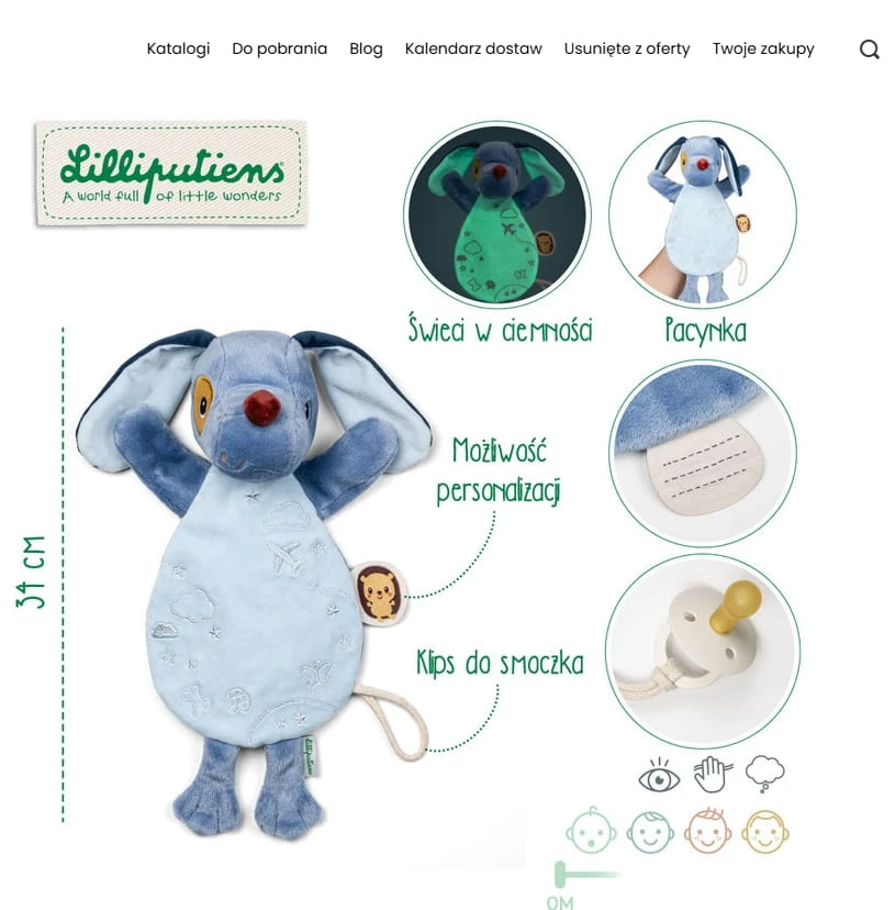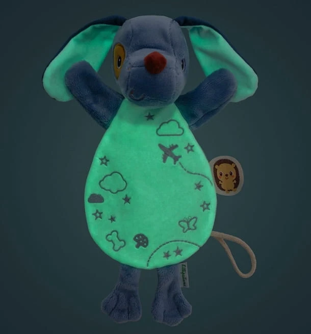 Ma postać uroczego niebieskiego pieska z długimi uszami, sznurkową zawieszką do przypięcia smoczka oraz fluorescencyjnymi elementami – jego uszka i brzuszek świecą w ciemności, zapewniając dziecku komfort i spokój nocą.