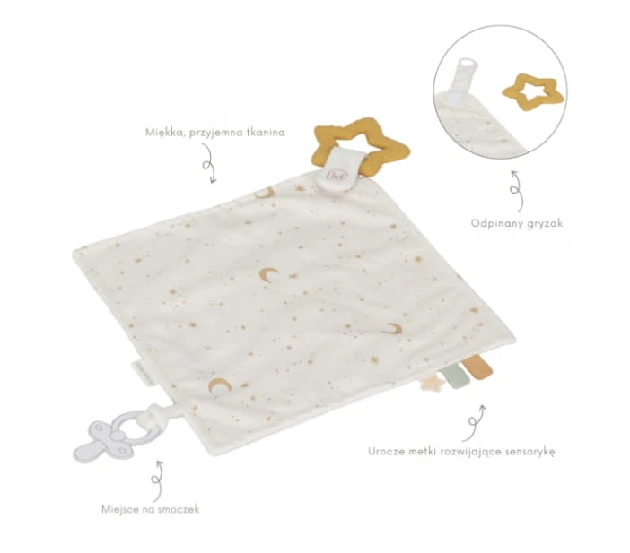 - Pętelka do smoczka i odczepiany gryzak w kształcie gwiazdki – funkcjonalność i zabawa w jednym.