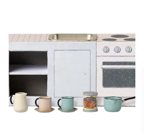 Ten mały blat kuchenny Maileg został stworzony z myślą o kuchniach w domkach dla myszy, takich jak SuitCasa. Zestaw jest pełen realistycznych detali, które zachęcają do kreatywnej zabawy i odgrywania codziennych scenek.