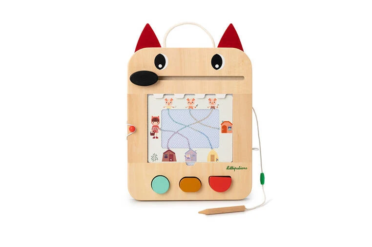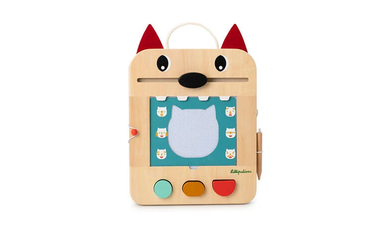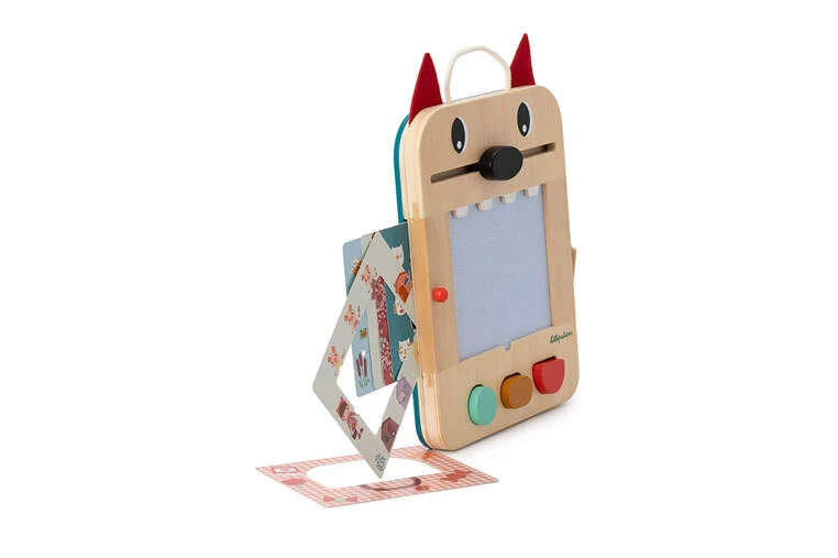 Drewniana tablica-znikopis z kolekcji Wilk Louis belgijskiej marki Lilliputiens to niebanalne źródło rozrywki i nauki dla ciekawskich maluszków. Zabawka ma kształt otwartej paszczy wilka, wnętrze której stanowi ekran, przeznaczony do rysowania. W zestawie znajduje się 6 kart z propozycjami zabaw, 3 magnetyczne klocki w różnych kształtach, które można odciskać na tablicy, pisać nimi lub tworzyć rysunki w różnych kolorach. Miejsce na te magnesy jest w dole planszy. U góry umieszczony jest nos wilka, dzięki przesuwaniu którego można wyczyścić ekran i zacząć od nowa. Tabliczka ma też filcowe wilcze uszy i sznurek do zawieszenia. Została solidnie wykonana, jest w pełni bezpieczna, pomalowana farbami na bazie wody. Zaskakuje i pobudza dziecięcą wyobraźnię. Rozwija koordynację ręka-oko, małą motorykę, aktywizuje zmysł wzroku. Idealnie nadaje się na prezent.