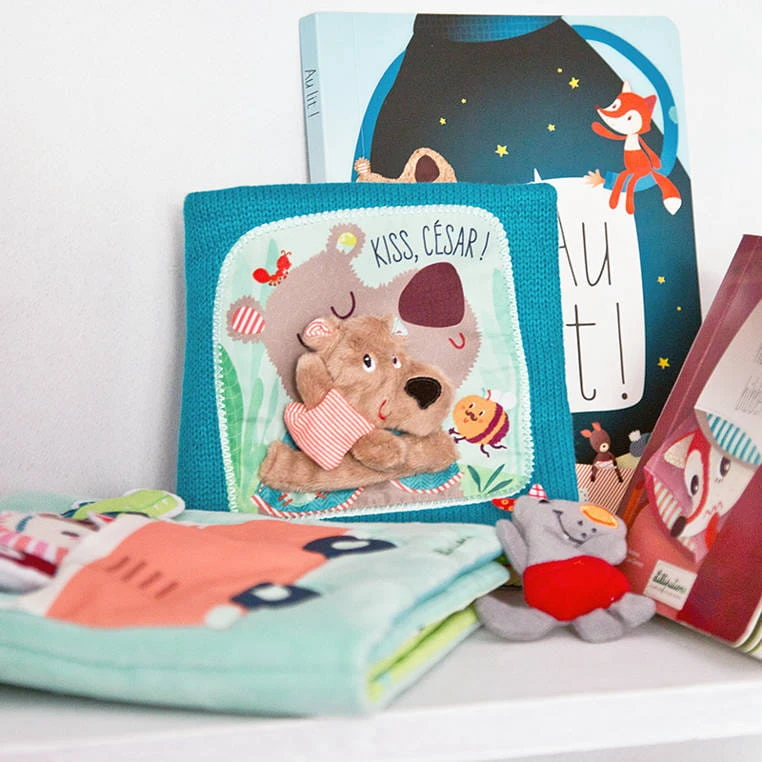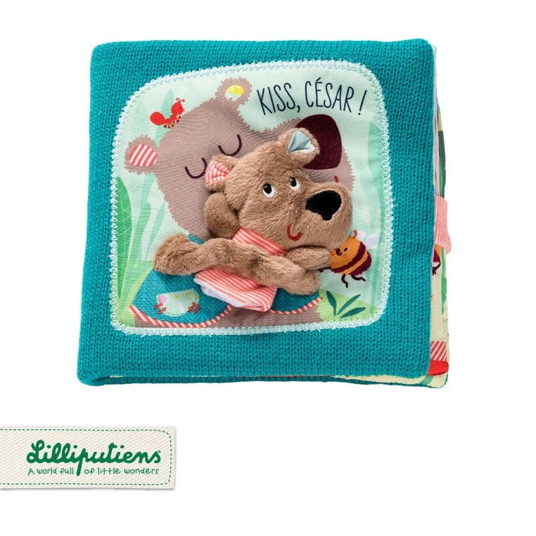 Miękka książeczka sensoryczna „Buziaki dla Cezara” od Lilliputiens – z pacynką, szeleszczącymi elementami i miejscem na zdjęcie dziecka. Wspiera rozwój emocjonalny i pomaga w nauce zasypiania. Dla dzieci 12m+.
