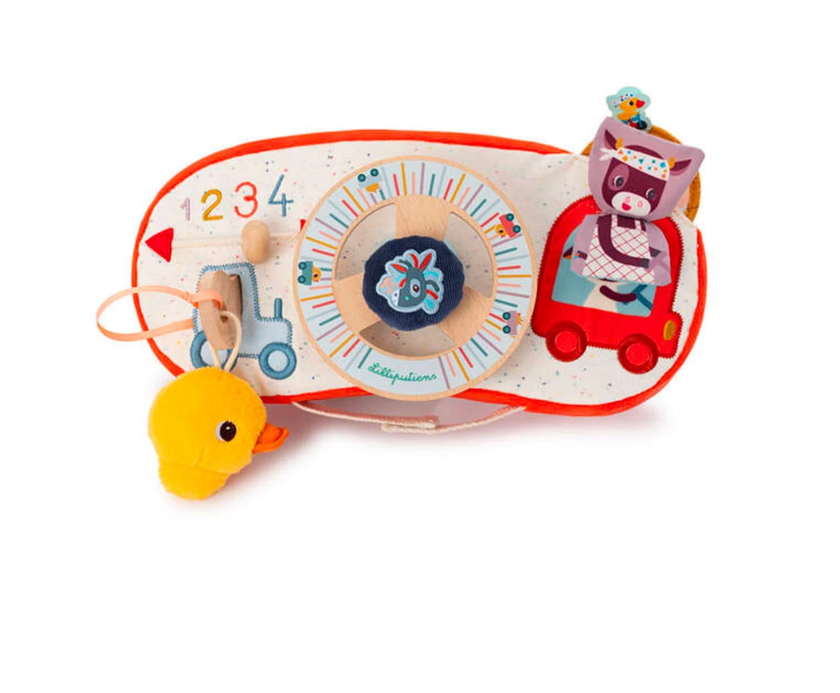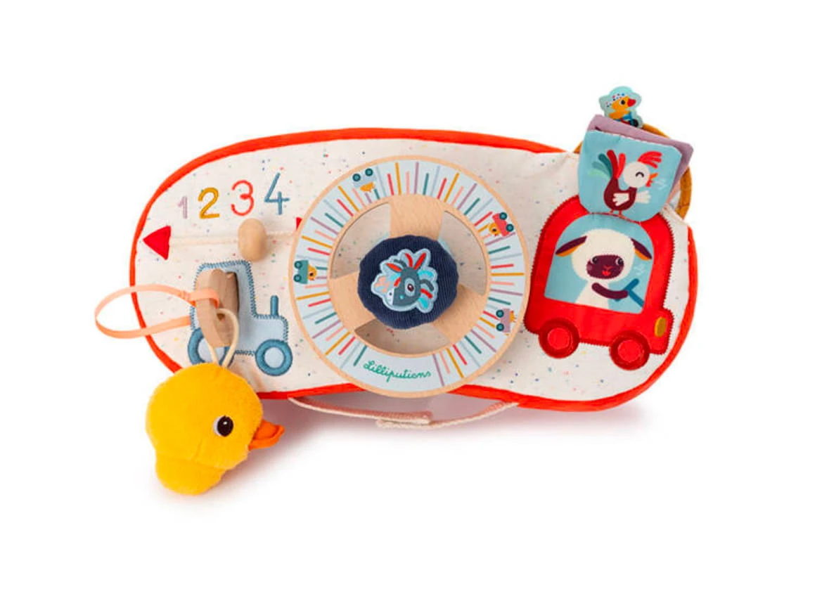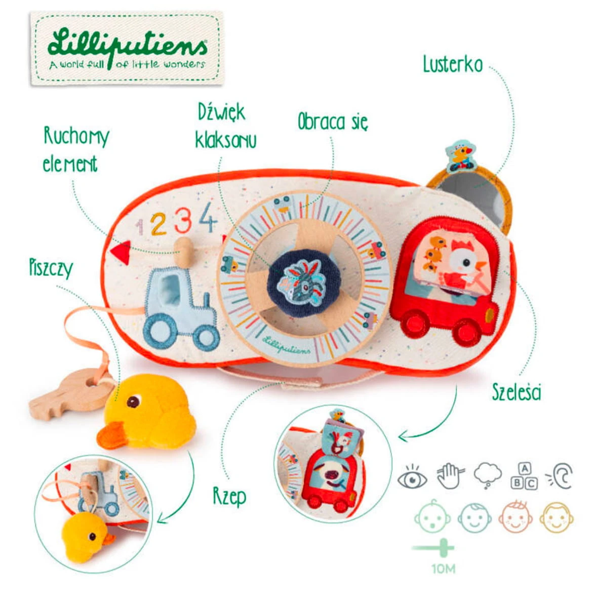 Miękka tablica aktywizująca Farma marki Lilliputiens to edukacyjna zabawka dla dzieci od 10 miesięcy. Wyposażona w drewnianą kierownicę, kluczyk-piszczałkę, lusterko.
