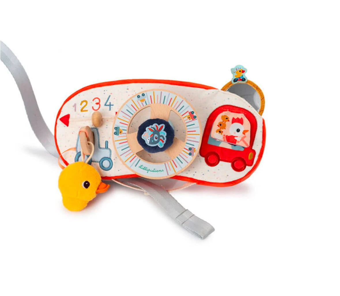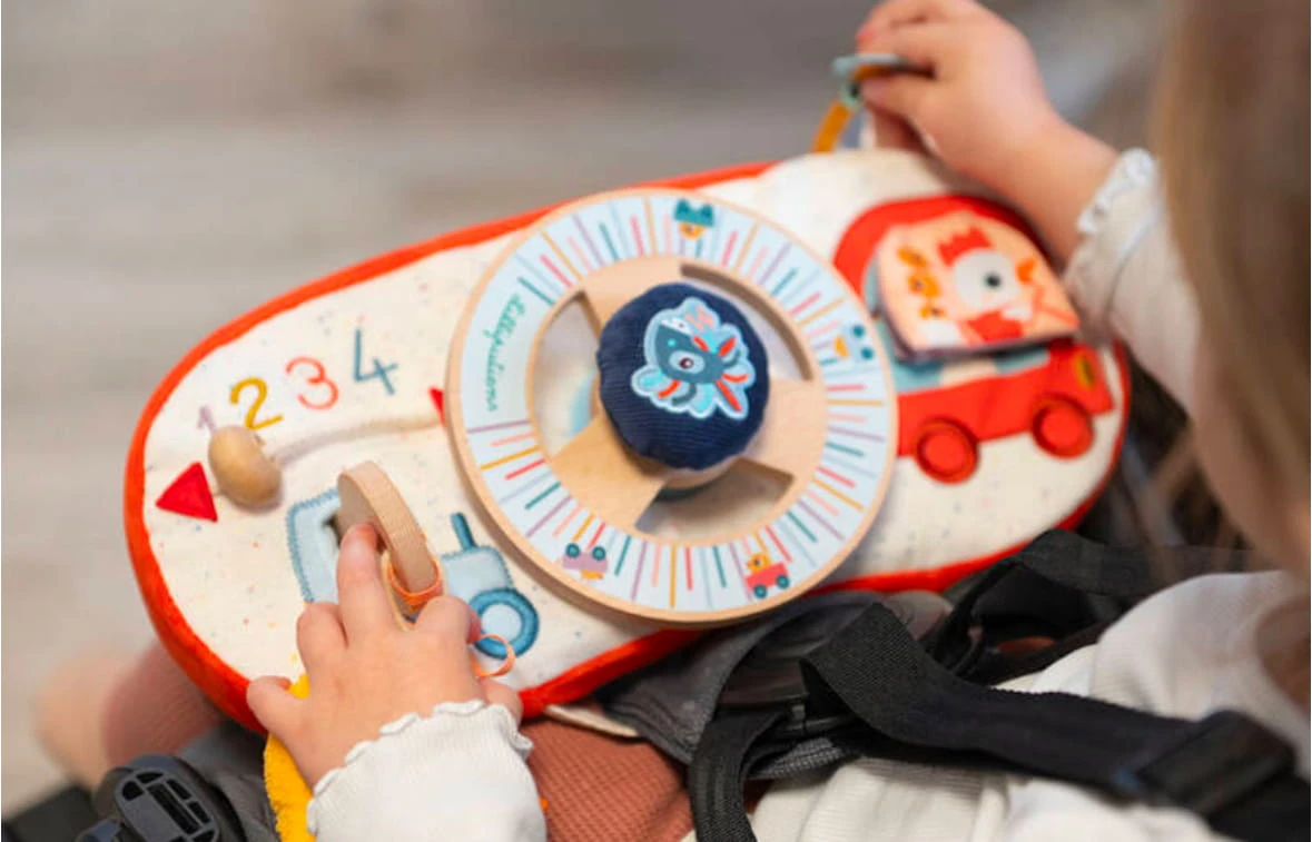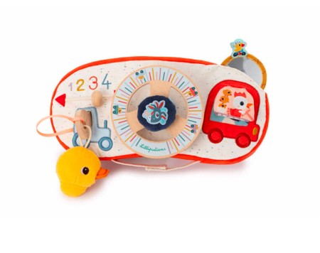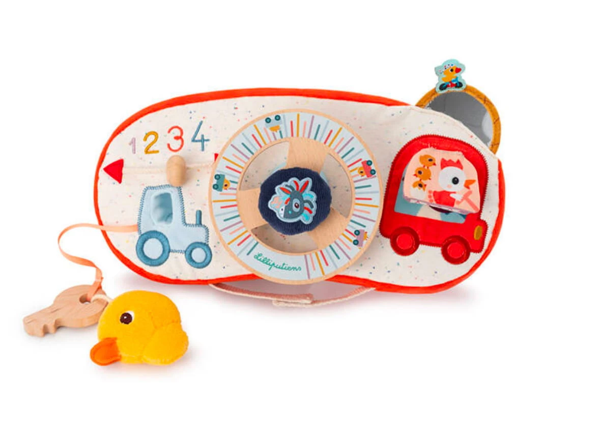 Miękka tablica aktywizująca Farma marki Lilliputiens to edukacyjna zabawka dla dzieci od 10 miesięcy. Wyposażona w drewnianą kierownicę, kluczyk-piszczałkę, lusterko.
