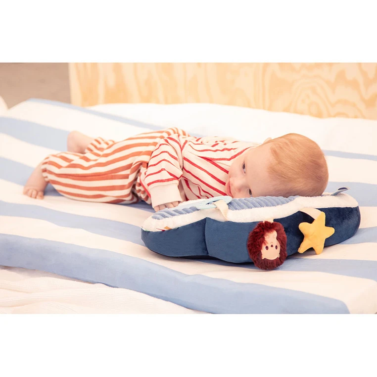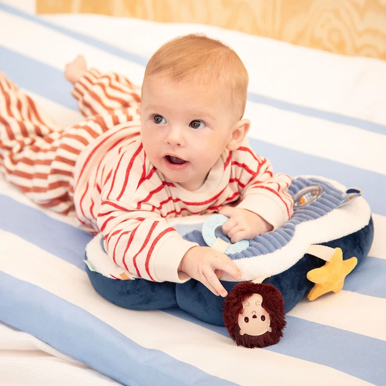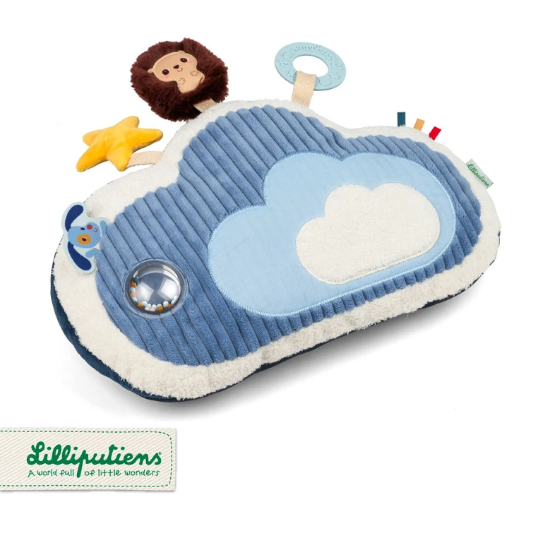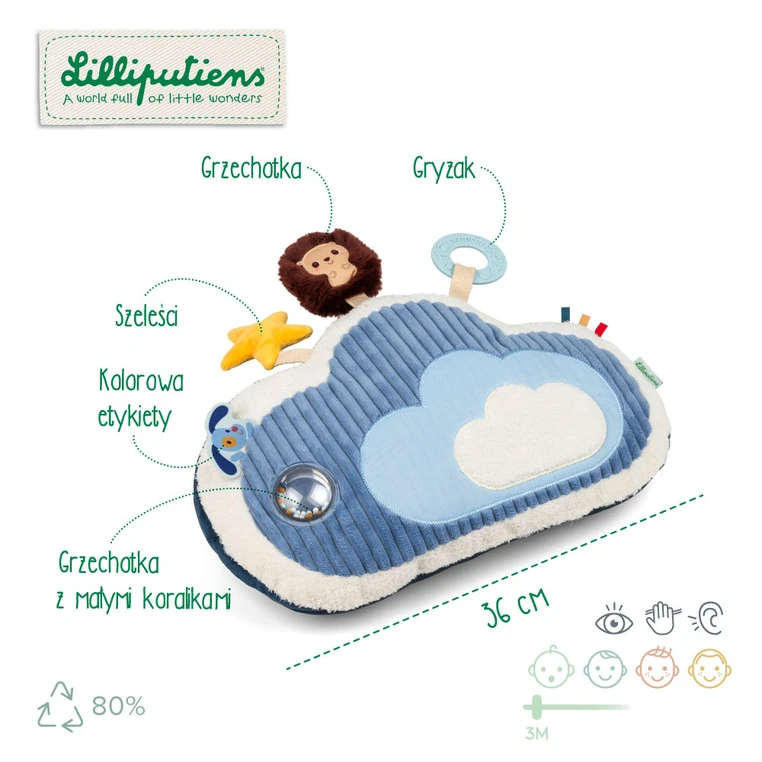 Poduszka aktywizująca z kolekcji Piesek Jules belgijskiej marki Lilliputiens to miękka chmurka, stworzona z myślą o wspieraniu pierwszych odkryć maluszka. Stanowi wygodne oparcie podczas czasu spędzanego na brzuszku, zachęcając dziecko do unoszenia głowy i poznawania otoczenia.