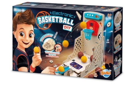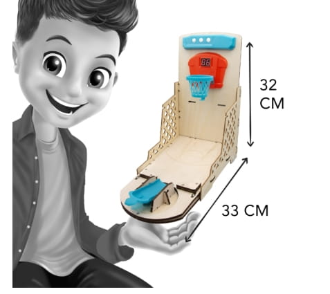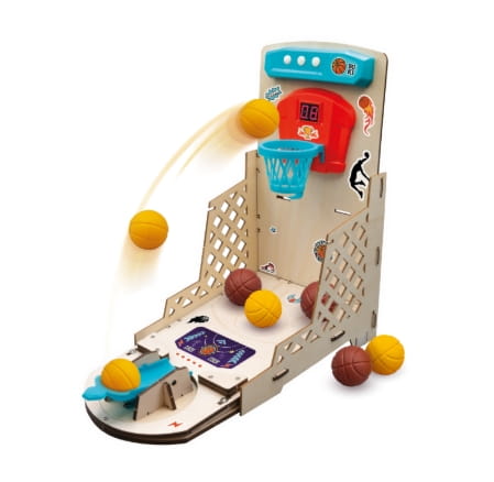 Stwórz własne elektroniczne mini boisko do koszykówki i ciesz się emocjonującą grą pełną dźwięków, rywalizacji i zabawy! Zestaw pozwala dzieciom samodzielnie zmontować urządzenie wykorzystując dołączony śrubokręt – wszystkie elementy łączą się bez użycia kleju, co czyni montaż prostym i bezpiecznym.