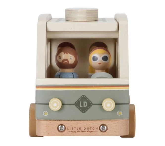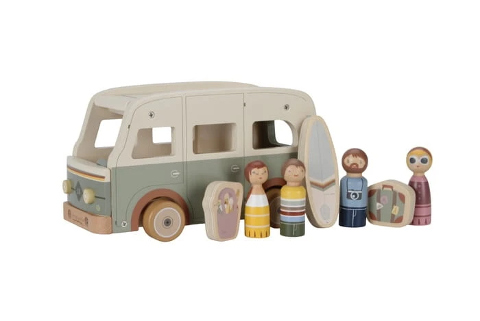 Drewniany Campervan Vintage od Little Dutch z 4 postaciami, deską surfingową, walizką i koszykiem to idealna zabawka rozwijająca wyobraźnię i motorykę dziecka. Dach i bagażnik są otwierane. Dla dzieci 18m+.