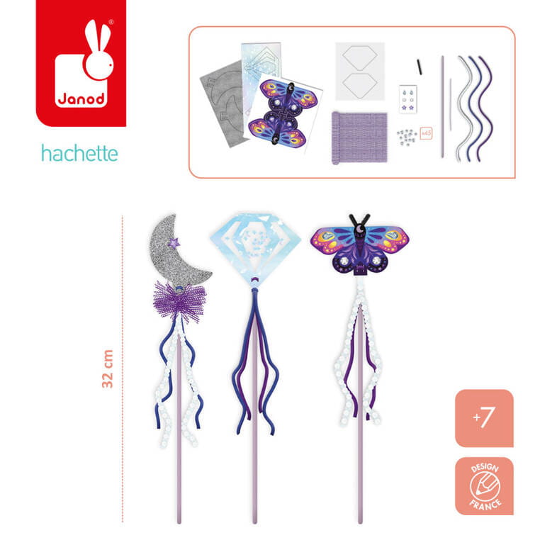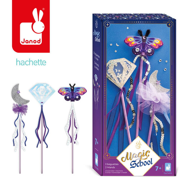 Zestaw kreatywny Szkoła magii – Janod to wyjątkowa propozycja dla dzieci od 7. roku życia, które kochają rękodzieło i zabawy w stylu fantasy. Umożliwia własnoręczne stworzenie 3 magicznych różdżek z dołączonych elementów: patyczków, koralików, wstążek, samoprzylepnych arkuszy z motywami (np. księżyc, motyl, diament) i innych dodatków.