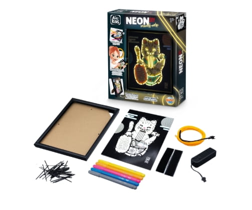 Zestaw DIY neonowy obrazek Maneki-neko dla dzieci 7+ pozwala stworzyć świecącą dekorację do pokoju. W komplecie obrazek do pokolorowania, mazaki, neonowy drucik i moduł z 3 trybami świecenia. Kreatywna zabawa rozwijająca zdolności manualne. Wymaga 2 baterii LR06 (brak w zestawie).
