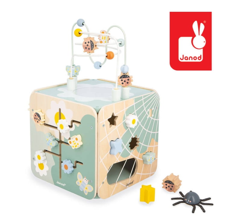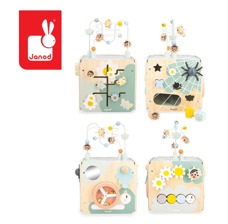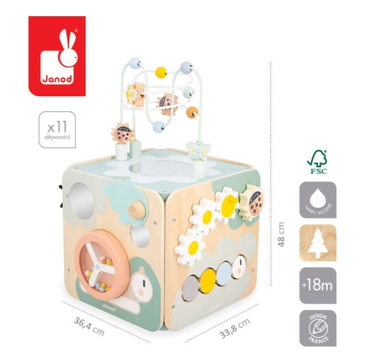 Duża, wielofunkcyjna drewniana kostka edukacyjna Ogród z serii Sweet Cocoon francuskiej marki JANOD to doskonała zabawka dla dzieci od 18. miesiąca życia. Kostka posiada bezpieczny kształt z zaokrąglonymi brzegami, który chroni maluszka przed urazami, a jej estetyczne wykonanie i piękne, pastelowe kolory (jasne drewno, szarości, biel z akcentami zieleni, niebieskiego, żółtego, pomarańczowego i różu) zachwycają zarówno dzieci, jak i rodziców.