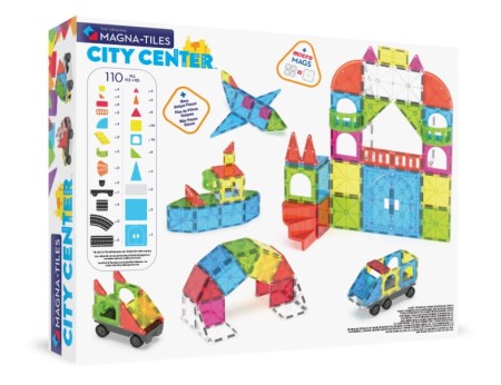 MAGNA-TILES® City Center 110 el. to zestaw kreatywnych klocków magnetycznych, który pozwala dzieciom budować własne miasto z ulicami, budynkami i pojazdami. Zawiera 110 elementów, w tym ruchome podwozia i osie kół, wspierając rozwój wyobraźni przestrzennej, zdolności manualnych oraz kreatywności. Idealny dla dzieci od 3 lat, kompatybilny z innymi zestawami MAGNA-TILES®.