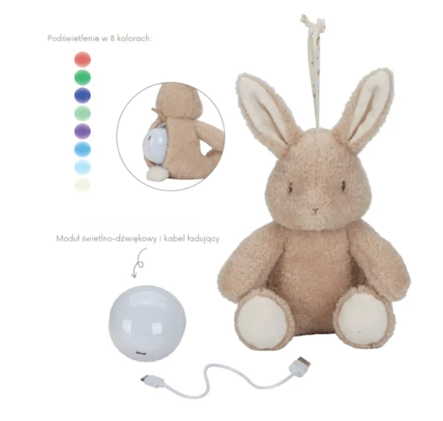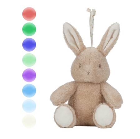Interaktywny Króliczek Newborn Naturals od Little Dutch – miękka przytulanka z lampką nocną i uspokajającymi dźwiękami. 8 kolorów światła, 3 tryby dźwięku (melodia, bicie serca, dźwięki prenatalne), ładowanie USB-C. Idealny dla niemowląt.