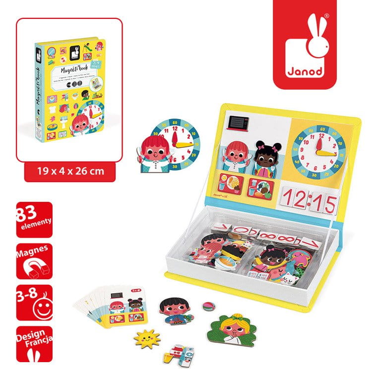 Magnetibook Uczę się zegarka marki Janod to magnetyczna układanka dla dzieci 3-8 lat, rozwijająca kreatywność i umiejętność odczytywania czasu. Zawiera 75 magnesów z cyframi, wskazówkami i ilustracjami aktywności oraz 8 kart z pomysłami na układanki.
