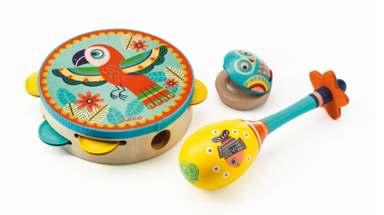 Zestaw trzech drewnianych instrumentów muzycznych dla dzieci: żółty marakas, niebieska klekotka i kolorowy tamburyn z czerwoną papugą. Idealny dla dzieci od 3 lat do rozwijania poczucia rytmu i kreatywności. Na opakowaniu znajduje się kod QR do odsłuchania brzmienia instrumentów. Produkt posiada oznaczenie CE.