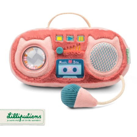 Przytulanka dźwiękowa z kolekcji Kotka Jeanne belgijskiej marki Lilliputiens w formie miękkiego, różowego radia-boomboxa, zostało stworzone z myślą o stymulowaniu zmysłów maluszka.